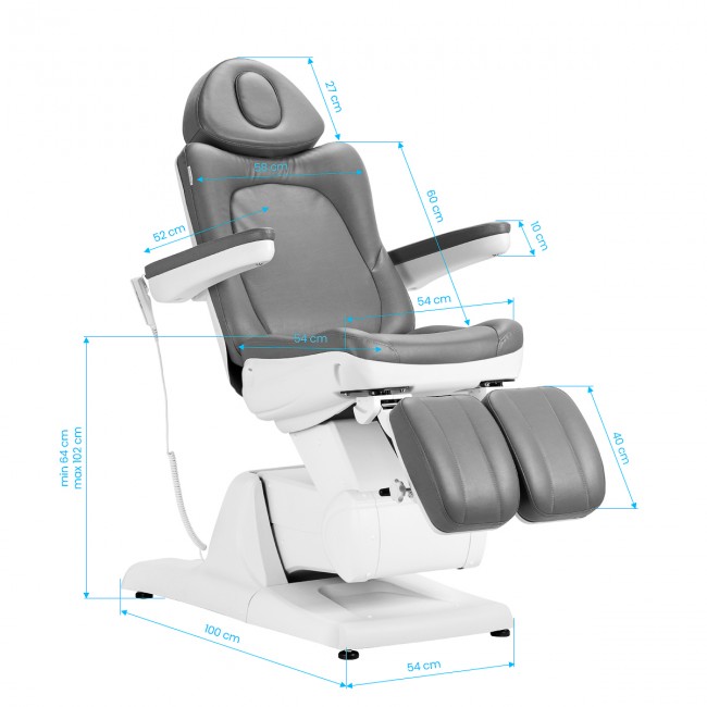A modern, electrically adjustable cosmetic chair that ensures comfort during the procedure not only for patients but also for those performing the procedure.