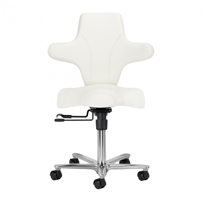 The five-star, suitably designed base makes the stool stable, even during intensive work. Additionally, it is equipped with wheels , which makes it easier to move. The chair is stable and durable . The upholstery is made of imitation leather in shades of white, thanks to the use of such material it is resistant to moisture and easy to clean .