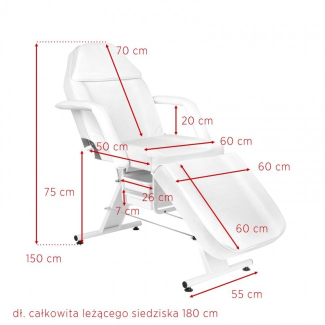 A special mechanism ensures gradual adjustment of the footrest and backrest angles . Using the lever, you can freely adjust the chair's position. This allows for optimal adjustment to individual needs , for proper and comfortable performance of treatments and high comfort of use. The chair can be folded out to a couch position , which significantly increases its functionality. This allows you to freely perform various types of treatments, including cosmetics, physiotherapy or tattooing.