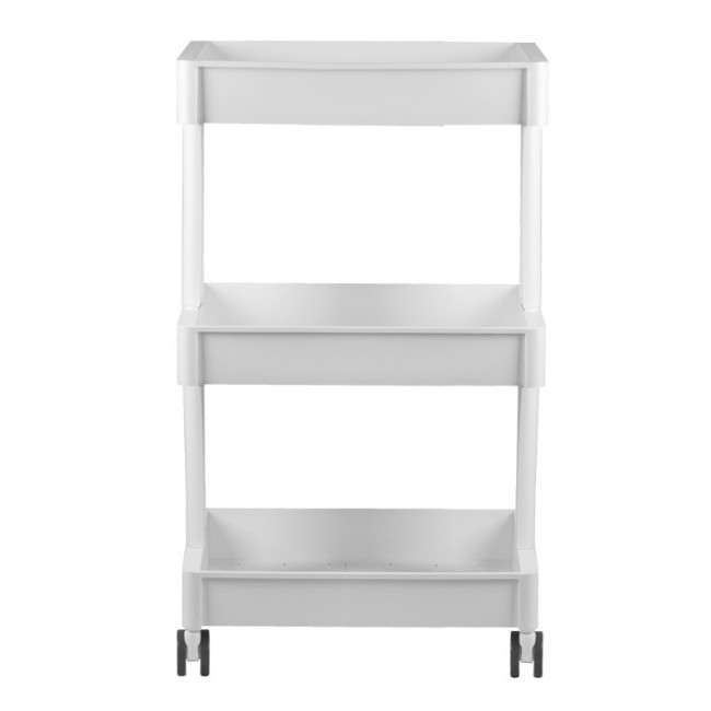 Functional plastic table on rubber wheels. The table has three shelves with a railing to prevent the contents from falling out.