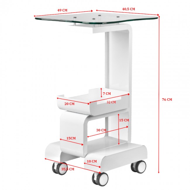 Functional, metal and glass table with rubber wheels with a locking function. It works perfectly as a table for a cosmetic device. It has a stable shelf for the device and another for accessories and thanks to the wheels the table is mobile and easy to move. The furniture provides convenience and comfort while working.