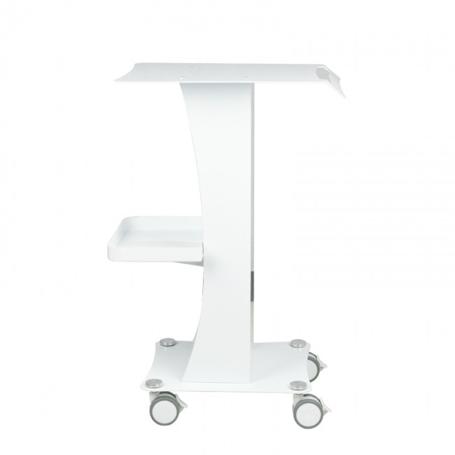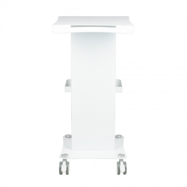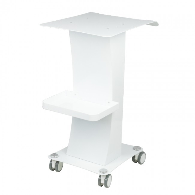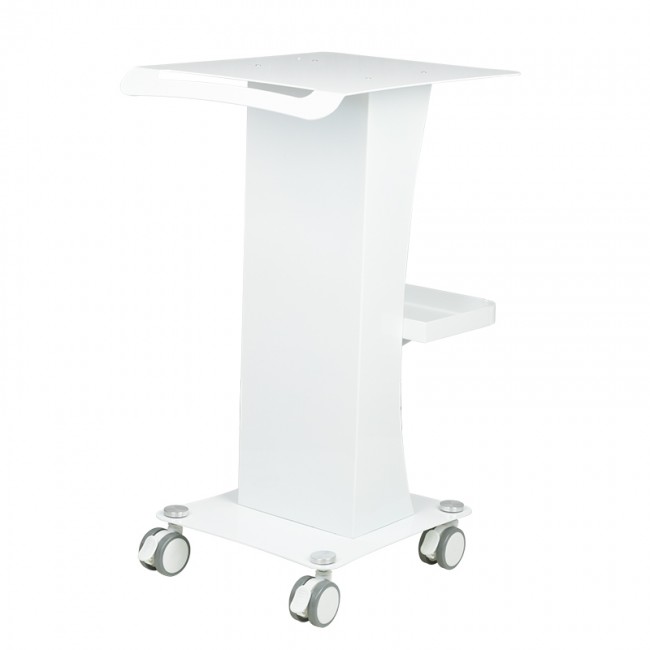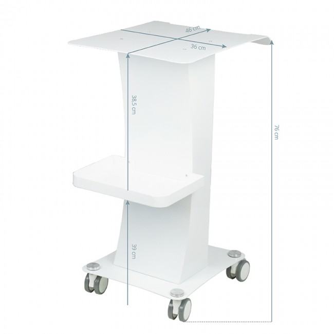 Functional, metal table with rubber wheels with a locking function. It works perfectly as a table for a cosmetic device. It has a stable shelf for the device and another for accessories and thanks to the wheels the table is mobile and easy to move. The furniture provides convenience and comfort during work.