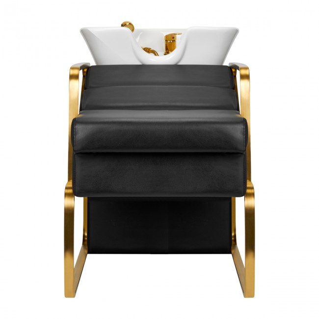 The modern Gabbiano hairdressing wash station is a combination of functionality and Italian elegance. The wash station is made of the highest quality materials and perfectly finished. We know how important the client's comfort is during treatments, which is why the special construction provides the client with solid head support during washing. The soft and extremely comfortable seat is covered with high-quality eco-leather in gray. The wash station has a white ceramic bowl and gold armrests. The perfect piece of furniture for modern interiors.