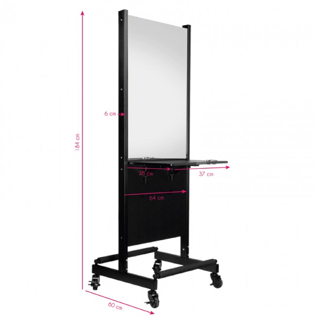 Gabbiano console is a professional piece of furniture with two mirrors. Smoothly working wheels allow you to quickly and easily move the console to any place. Stable, metal construction powder coated in black. Convenient to use shelves with the option of folding and wheels equipped with a practical brake.