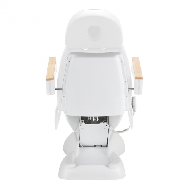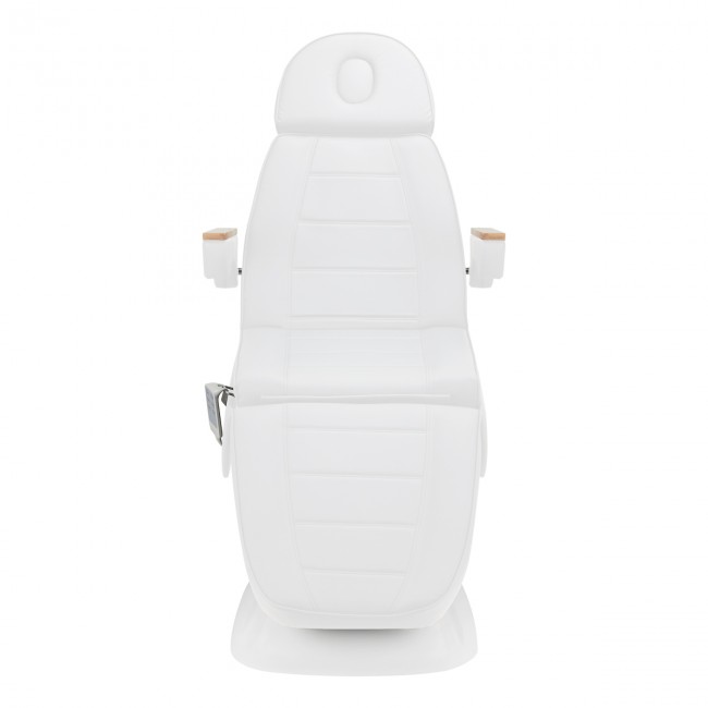 Fotel wypełniony jest pianką o odpowiedniej twardości oraz pokryty przyjemną w dotyku imitacją skóry w odcieniach bieli. Dzięki użyciu materiału, który jest łatwy do utrzymania w czystości oraz odporny na wybrane środki dezynfekcji, sprzęt jest komfortowy w użytkowaniu, wytrzymały na wilgoć oraz nieskomplikowany w czyszczeniu. Solidna podstawa wykonana z trwałego materiału w odcieniach bielizapewnia stabilność w trakcie zabiegów. Ozdobne drewniane elementy na podłokietnikach wyróżniają fotel pośród innych modeli, stanowiąc atrakcyjny wizualnie, elegancki akcent. Odpowiednio wyprofilowane obszycia nadają fotelowi stylowy wygląd i sprawiają, że siedzisko jest ergonomiczne.