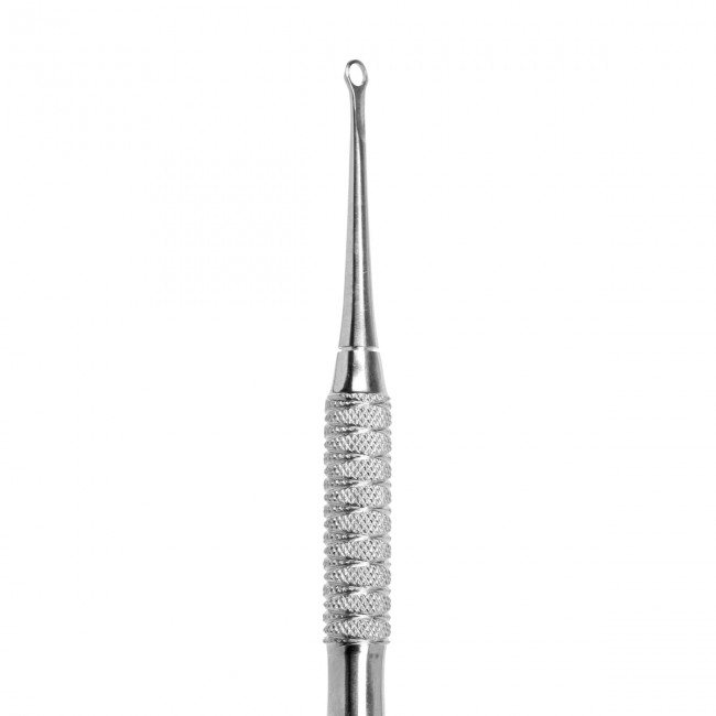 • Precyzyjne pierścieniowe oczko umożliwia dokładne oczyszczenie przestrzeni między paznokciem a skórkami oraz usunięcie drobnych niedoskonałości.