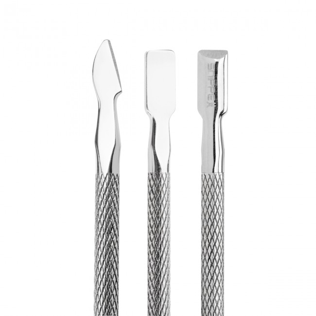 • Ścięty nożyk służy do wycinania skórek, zwłaszcza z boków płytki. Sposób wyprofilowania końcówki ułatwia precyzyjną pracę.