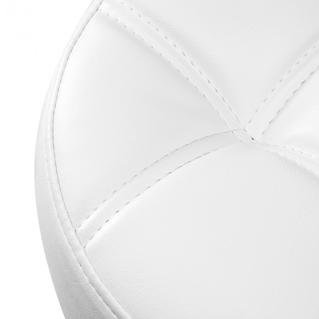 Pięcioramienna podstawa zapewnia stabilność oraz bezpieczeństwo użytkowania, nawet przy częstych zmianach pozycji. Gumowane kółka pozwalają swobodnie przemieszczać się po salonie. Obicie z wytrzymałej skóry syntetycznej w odcieniach bieli jest odporne i łatwe do utrzymania w czystości. Ozdobne pikowanie dodaje elegancji i podkreśla profesjonalny charakter taboretu.