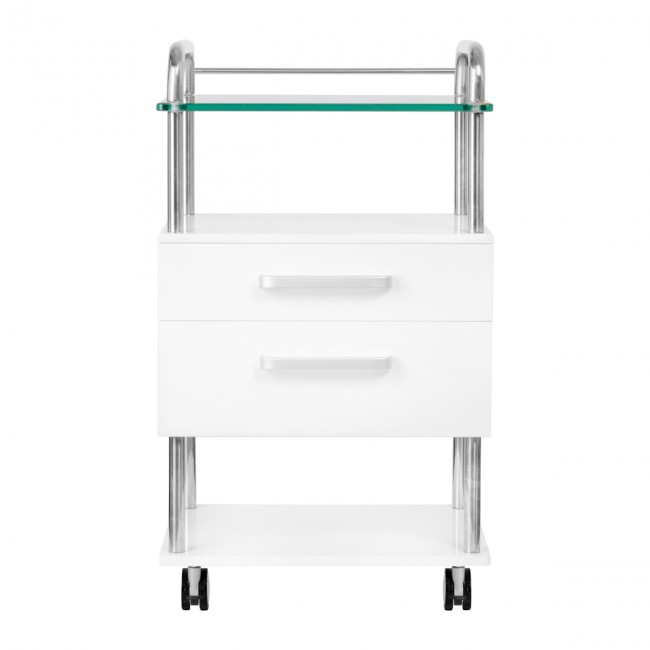 High-quality podiatry assistant is a functional cosmetic furniture on wheels. Thanks to its mobility, you can transport it to other treatment rooms. The assistant has a glass worktop, two drawers for tools, accessories and a shelf for a podiatry milling machine or other device.
