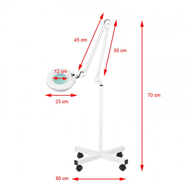 Lamp-Magnifying glass 5 diopters, LED lamp with adjustable light intensity on a four-arm stand. It allows you to view the skin in magnification while providing good lighting. Also used for manicure and pedicure treatments, permanent make-up, epilation. It has high visibility, anti-reflective glass and LED diodes that shine with white bright light without causing eye pain during longer work. It is ideal for beauty, dental and veterinary clinics and is used